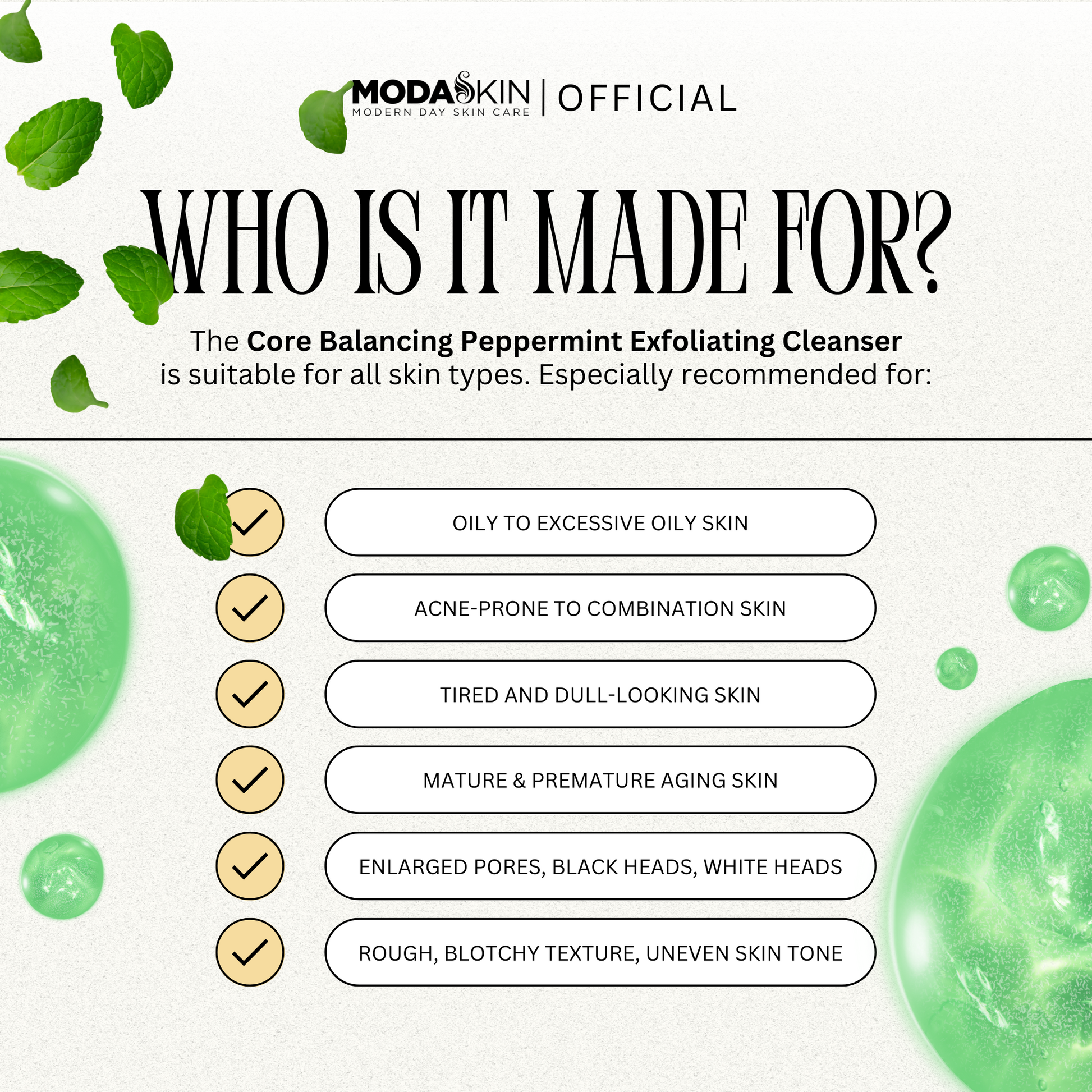 Core Balancing Peppermint Exfoliating Cleanser is Suitable for all Skin Types. Especially recommended for the for: